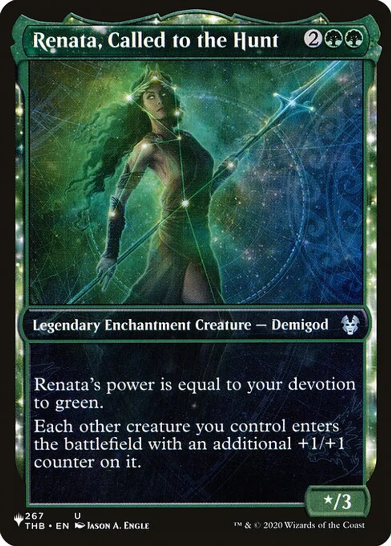 Magic: the Gathering (mtg) Uncommon Legendary Enchantment Creature - Demigod Renata, Called to the Hunt from The List (PLIST) last updated 2026-02-12 15:04:33