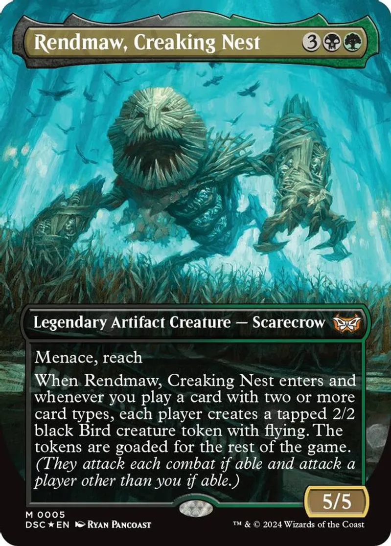 when rendmaw, creaking nest enters and whenever you play a card with two or more card types, each player creates a tapped 2/2 black bird creature token with flying. the tokens are goaded for the rest of the game. (they attack each combat if able and attack a player other than you if able.) | ||