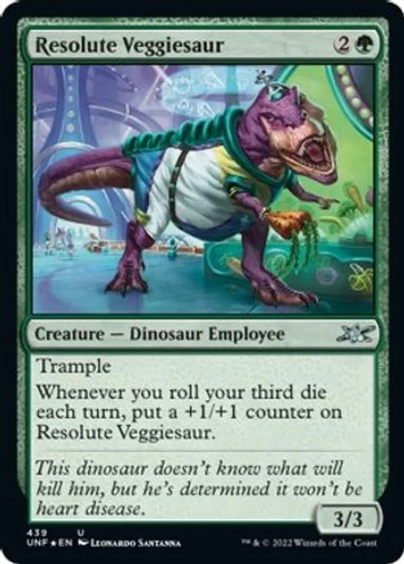 Whenever you roll your third die each turn, put a +1/+1 counter on Resolute Veggiesaur. | ||