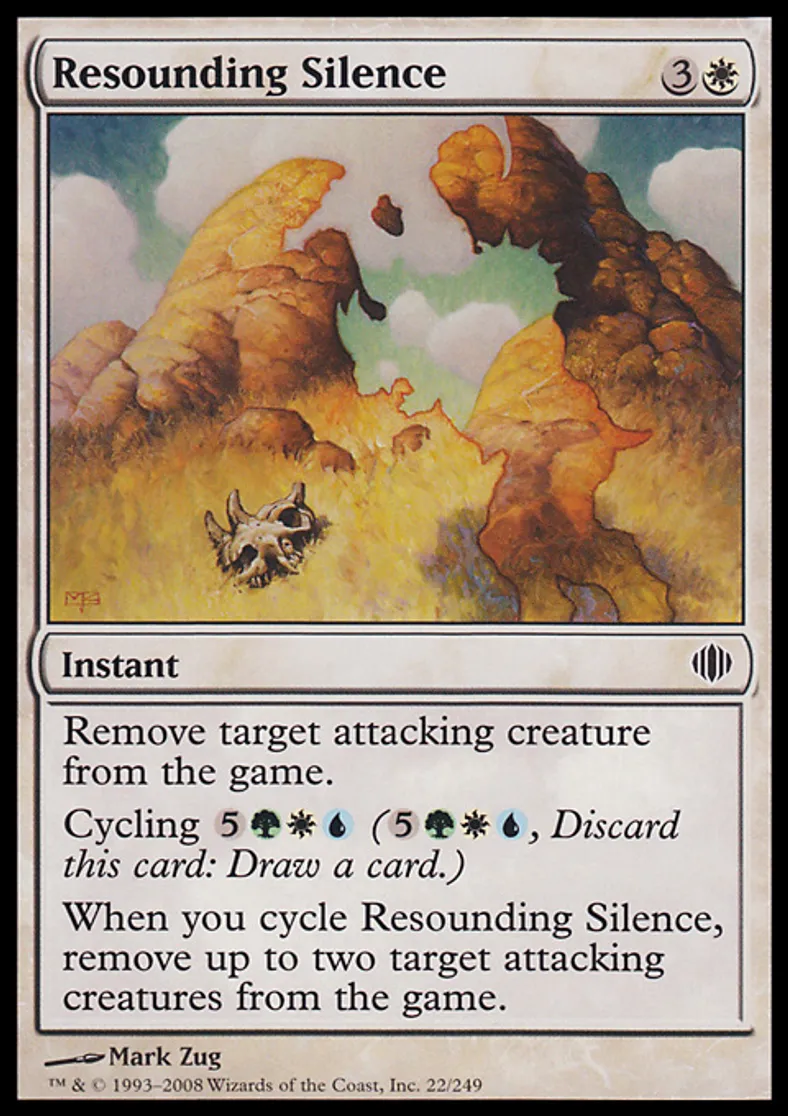 | Oracle Text | Exile target attacking creature. Cycling {{5}}{{g}}{{w}}{{u}} ({{5}}{{g}}{{w}}{{u}}, Discard this card: Draw a card.) When you cycle Resounding Silence, exile up to two target attacking creatures. | ||