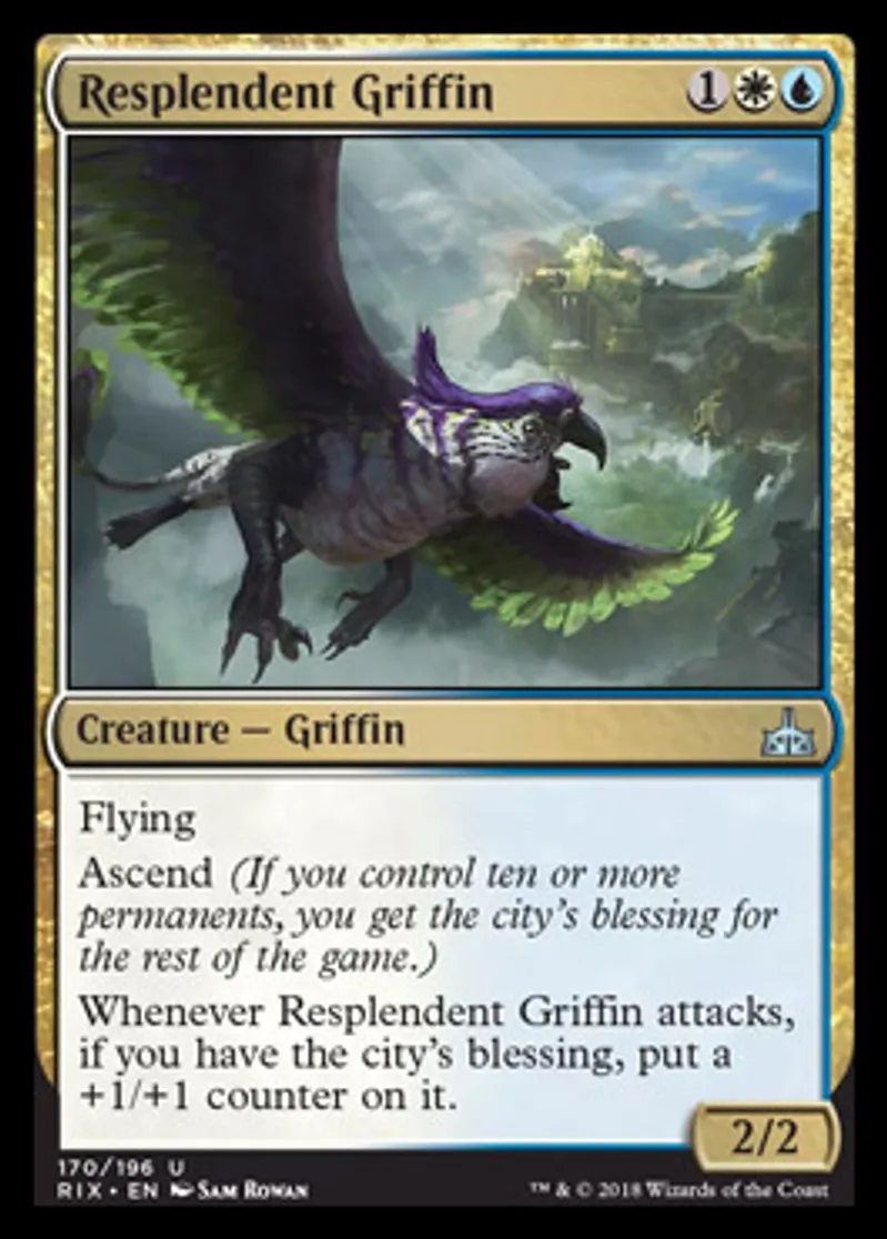 | Oracle Text | Flying Ascend (If you control ten or more permanents, you get the city's blessing for the rest of the game.) Whenever Resplendent Griffin attacks, if you have the city's blessing, put a +1/+1 counter on it. | ||