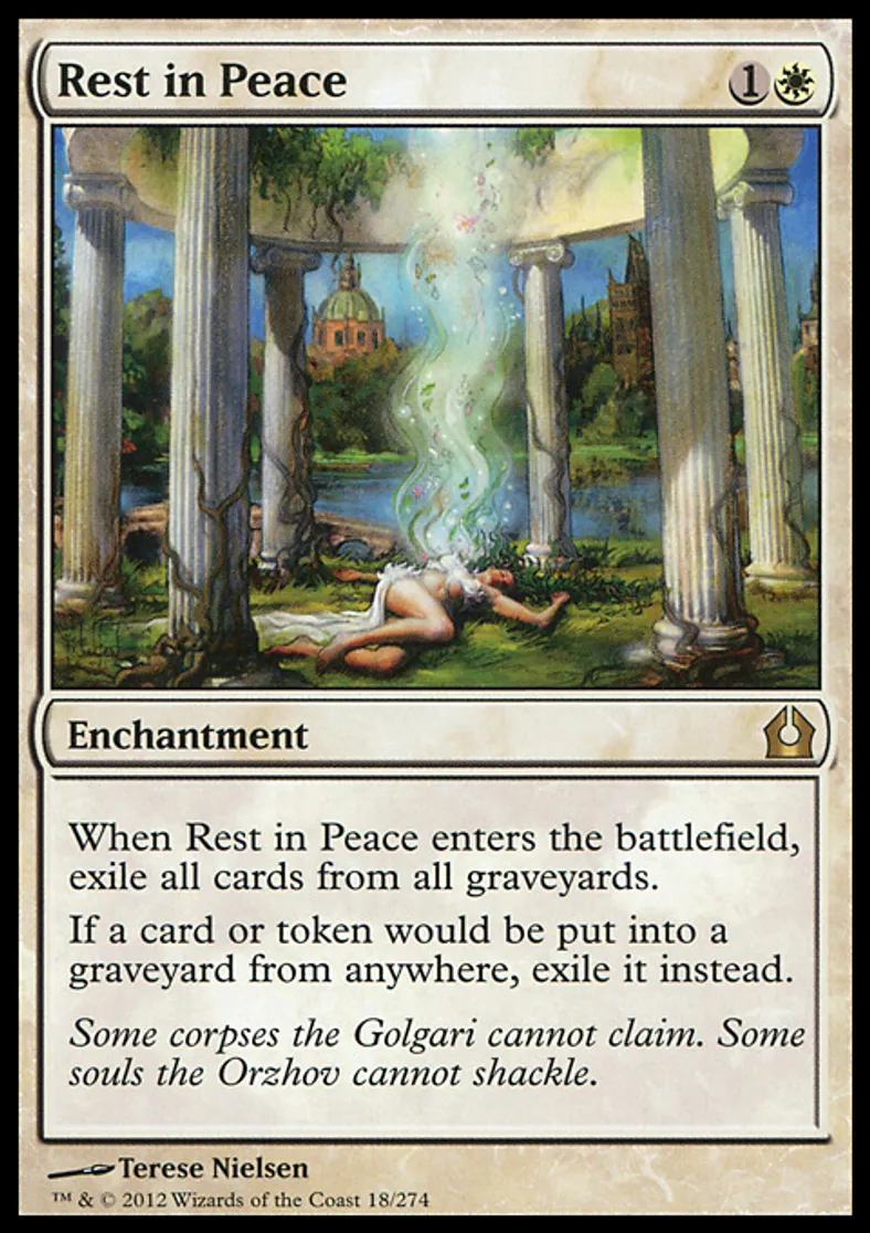 | Oracle Text | When Rest in Peace enters the battlefield, exile all cards from all graveyards. If a card or token would be put into a graveyard from anywhere, exile it instead. | ||