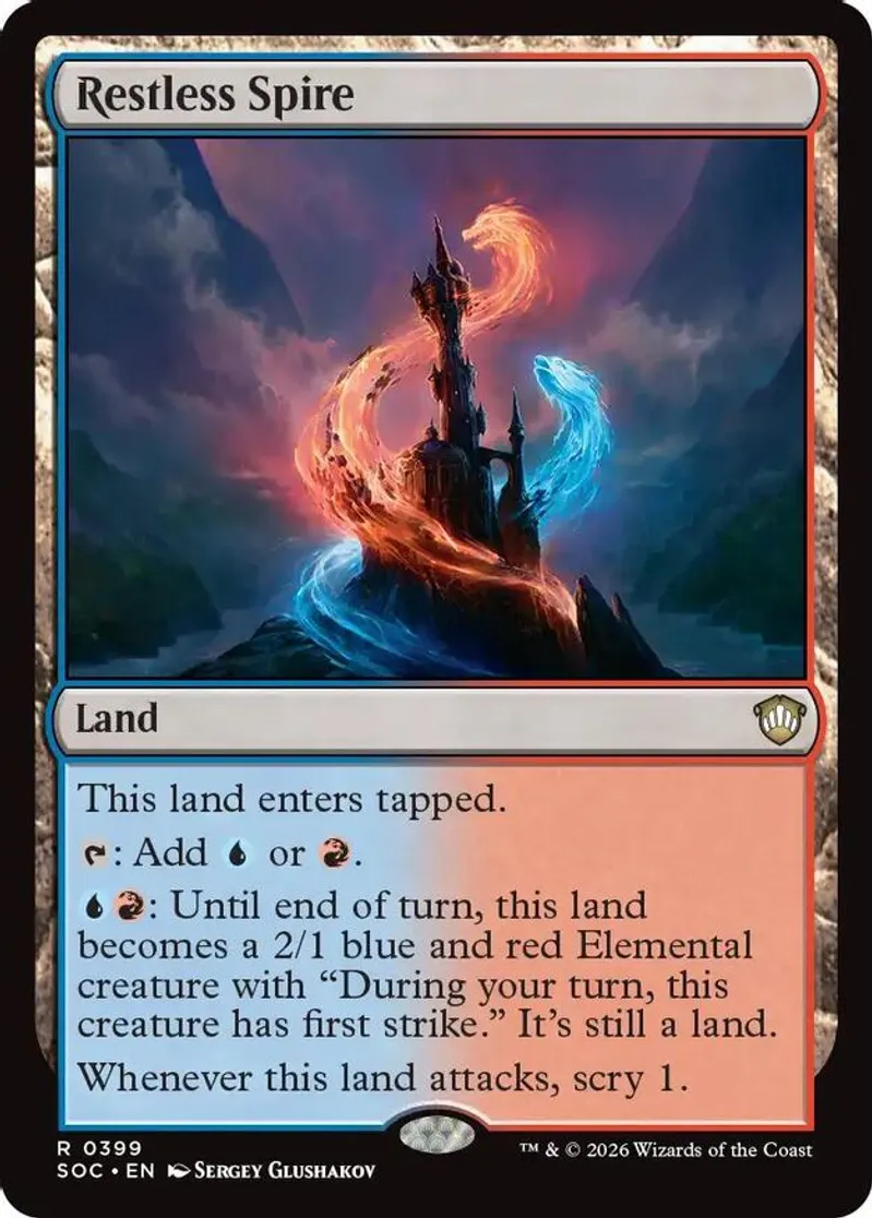 Magic: the Gathering (mtg) Rare land Restless Spire from Commander: Secrets of Strixhaven (SOC) last updated 2026-04-17 00:24:10