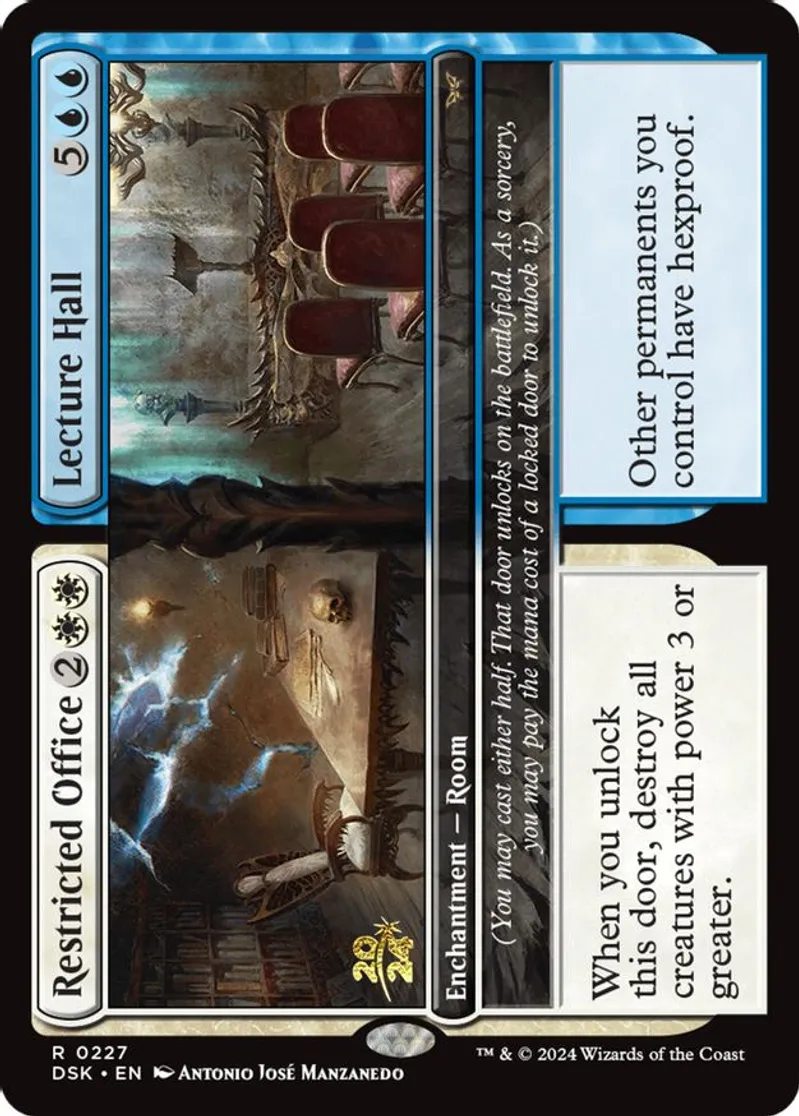| Oracle Text | restricted office when you unlock this door, destroy all creatures with power 3 or greater. / lecture hall other permanents you control have hexproof. | ||