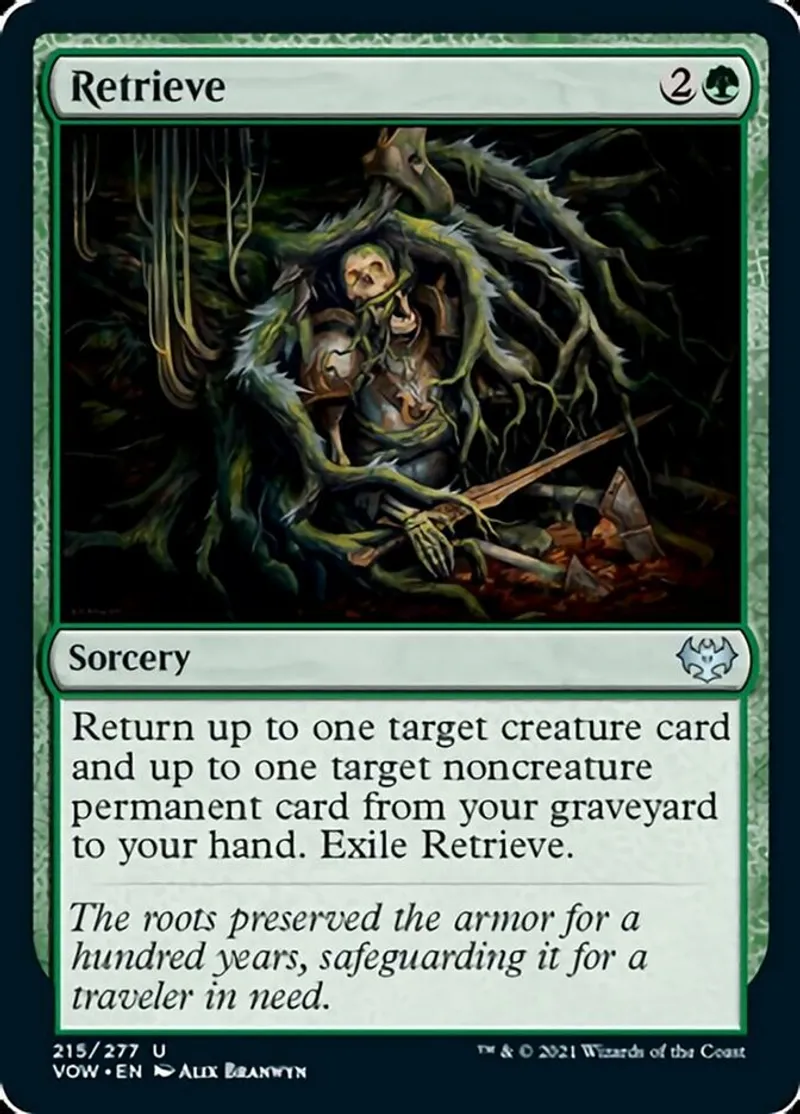 | Oracle Text | Return up to one target creature card and up to one target noncreature permanent card from your graveyard to your hand. Exile Retrieve. | ||