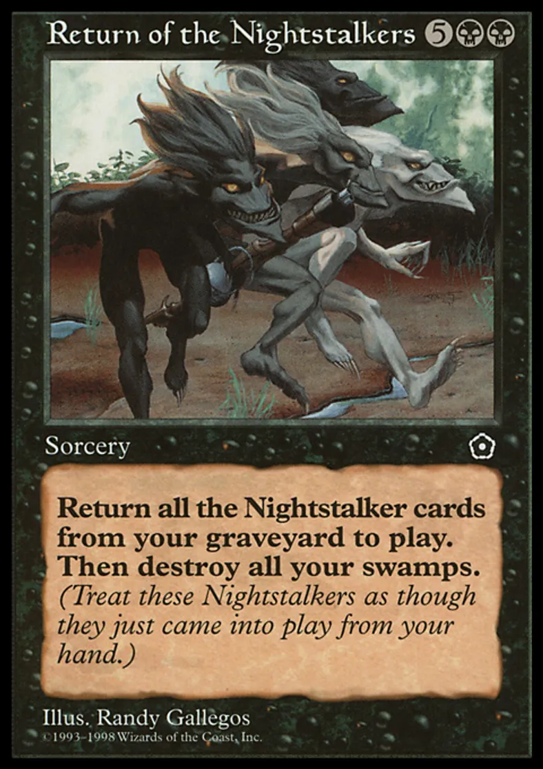 | Oracle Text | Return all Nightstalker permanent cards from your graveyard to the battlefield. Then destroy all Swamps you control. | ||