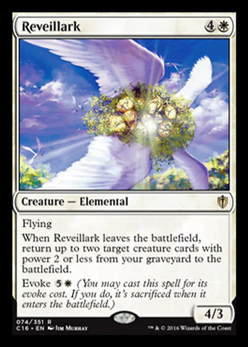 | Oracle Text | Flying When Reveillark leaves the battlefield, return up to two target creature cards with power 2 or less from your graveyard to the battlefield. Evoke {{5}}{{w}} (You may cast this spell for its evoke cost. If you do, it's sacrificed when it enters the battlefield.) | ||