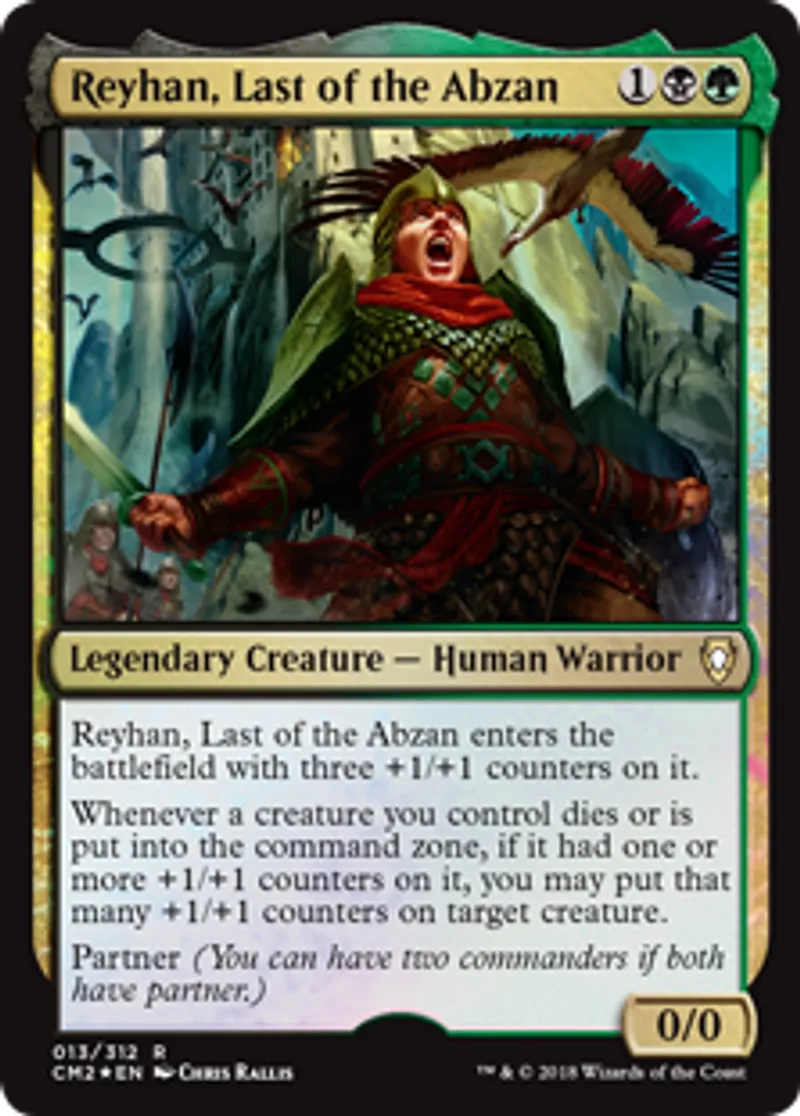 | Oracle Text | Reyhan, Last of the Abzan enters the battlefield with three +1/+1 counters on it. Whenever a creature you control dies or is put into the command zone, if it had one or more +1/+1 counters on it, you may put that many +1/+1 counters on target creature. Partner (You can have two commanders if both have partner.) | ||
