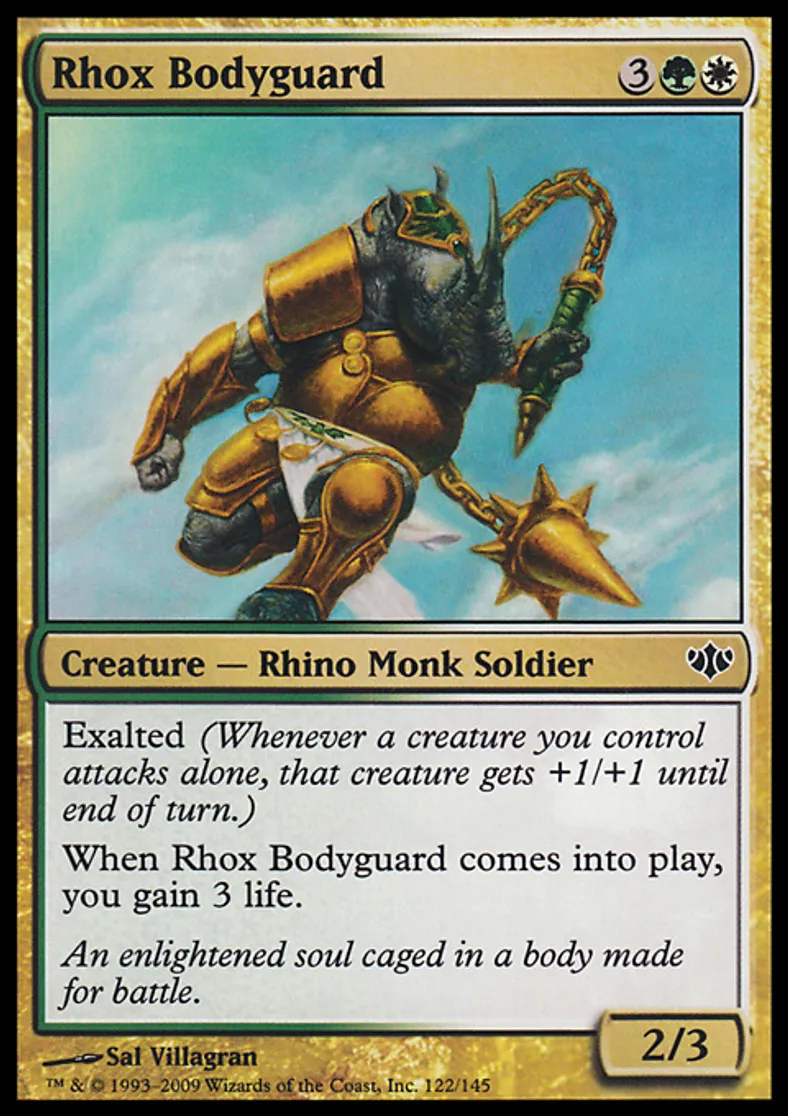 | Oracle Text | Exalted (Whenever a creature you control attacks alone, that creature gets +1/+1 until end of turn.) When Rhox Bodyguard enters the battlefield, you gain 3 life. | ||