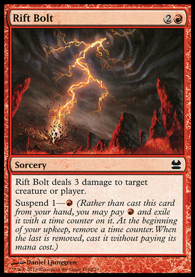 | Oracle Text | Rift Bolt deals 3 damage to target creature or player. Suspend 1—{{r}} (Rather than cast this card from your hand, you may pay {{r}} and exile it with a time counter on it. At the beginning of your upkeep, remove a time counter. When the last is removed, cast it without paying its mana cost.) | ||