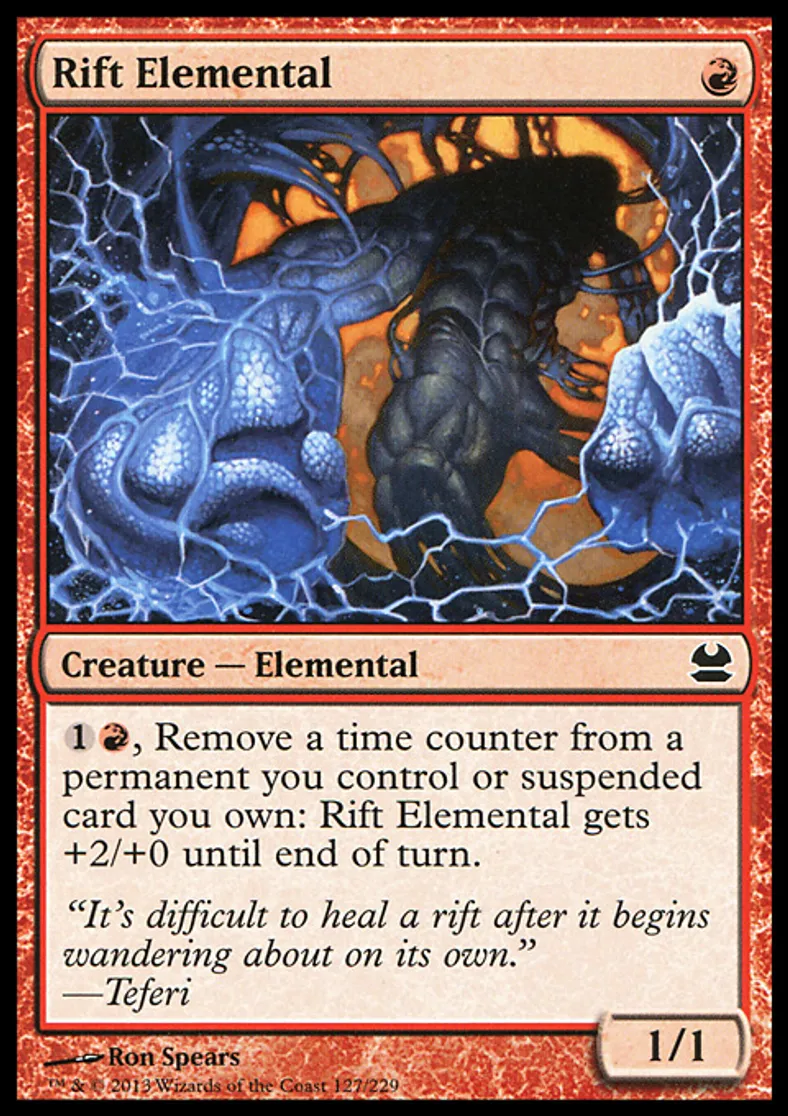 | Oracle Text | {{1}}{{r}}, Remove a time counter from a permanent you control or suspended card you own: Rift Elemental gets +2/+0 until end of turn. | ||