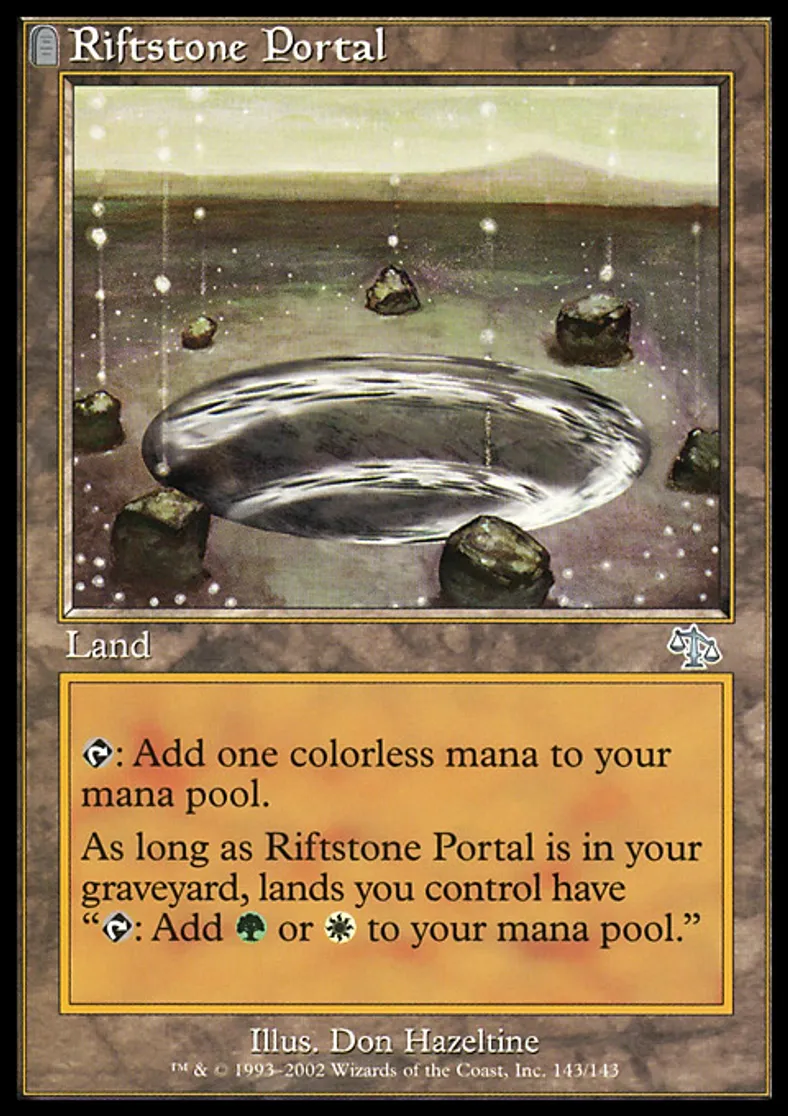 | Oracle Text | {{t}}: Add {{1}} to your mana pool. As long as Riftstone Portal is in your graveyard, lands you control have "{{t}}: Add {{g}} or {{w}} to your mana pool." | ||