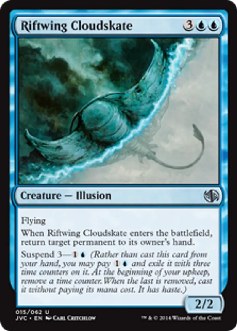 | Oracle Text | Flying When Riftwing Cloudskate enters the battlefield, return target permanent to its owner's hand. Suspend 3—{{1}}{{u}} (Rather than cast this card from your hand, you may pay {{1}}{{u}} and exile it with three time counters on it. At the beginning of your upkeep, remove a time counter. When the last is removed, cast it without paying its mana cost. It has haste.) | ||