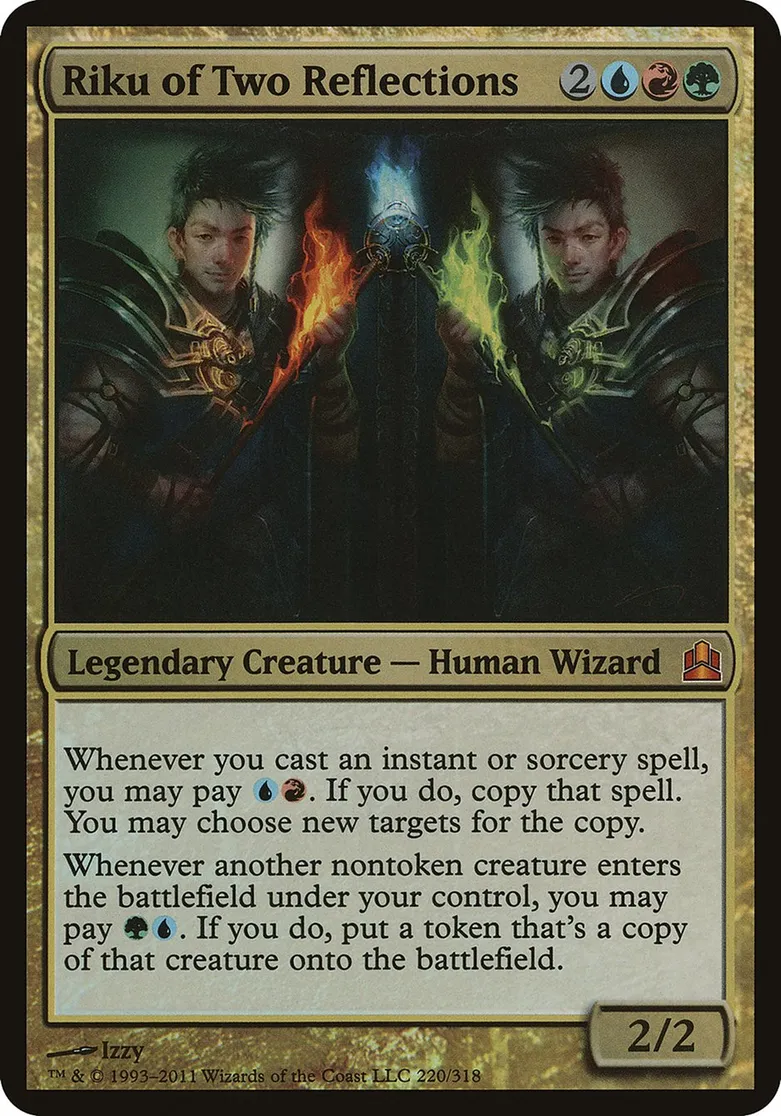 | Oracle Text | Whenever you cast an instant or sorcery spell, you may pay {{U}}{{R}}. If you do, copy that spell. You may choose new targets for the copy.\r\n\r\nWhenever another nontoken creature enters the battlefield under your control, you may pay {{G}}{{U}}. If you do, create a token that’s a copy of that creature. | ||