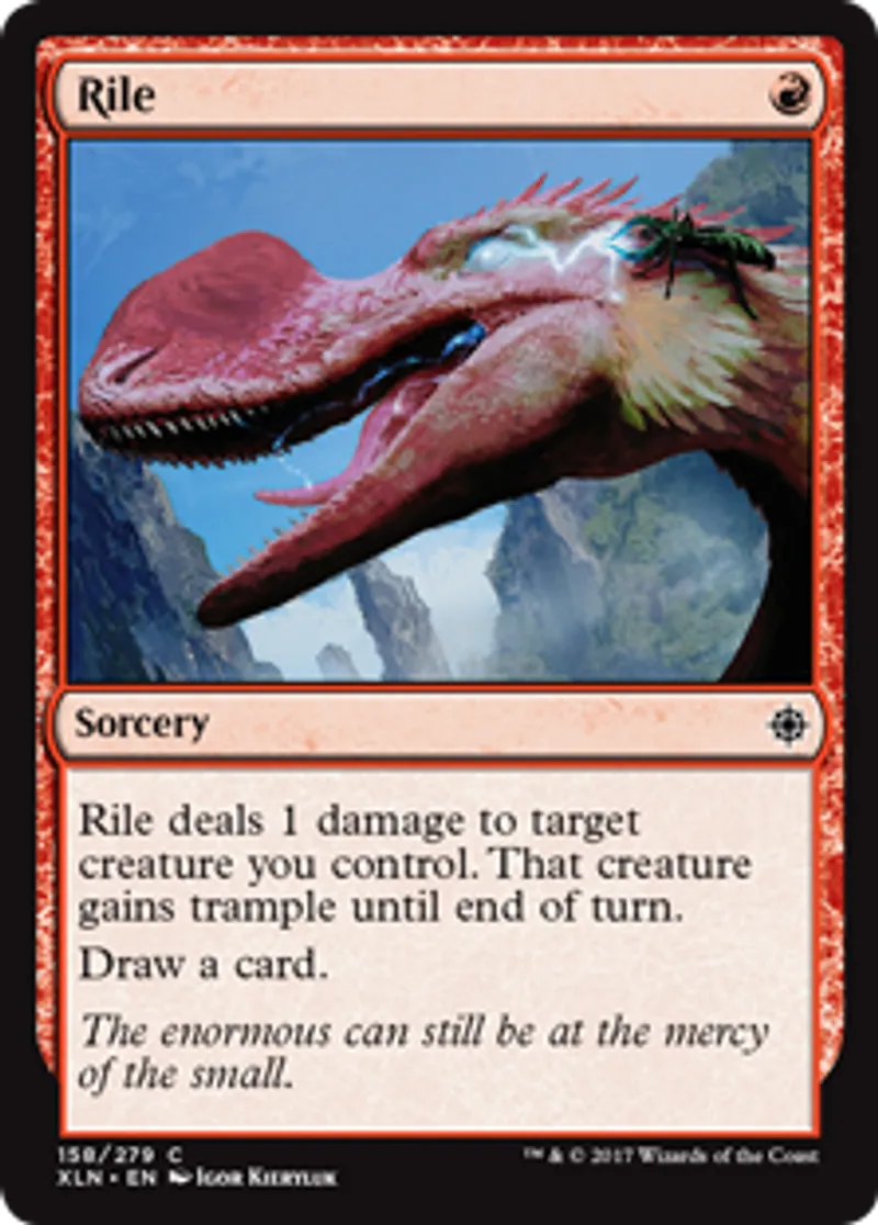 | Oracle Text | Rile deals 1 damage to target creature you control. That creature gains trample until end of turn. Draw a card. | ||