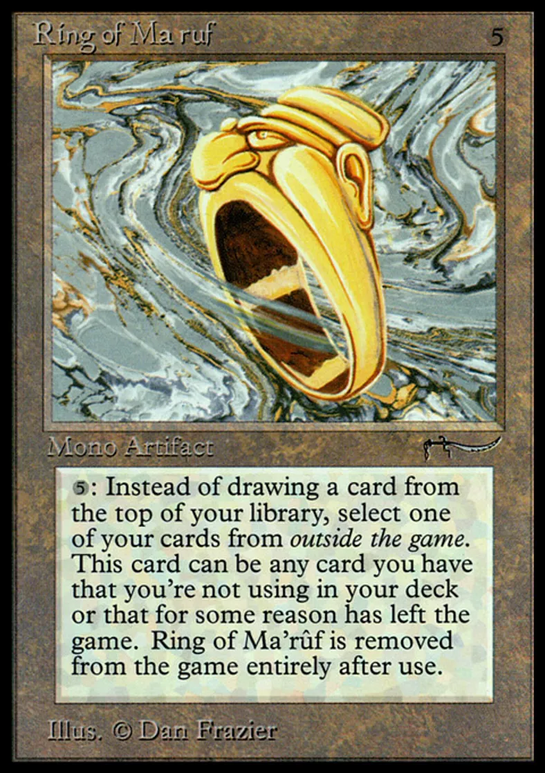 | Oracle Text | {{5}}, {{t}}, Exile Ring of Ma'rûf: The next time you would draw a card this turn, instead choose a card you own from outside the game and put it into your hand. | ||
