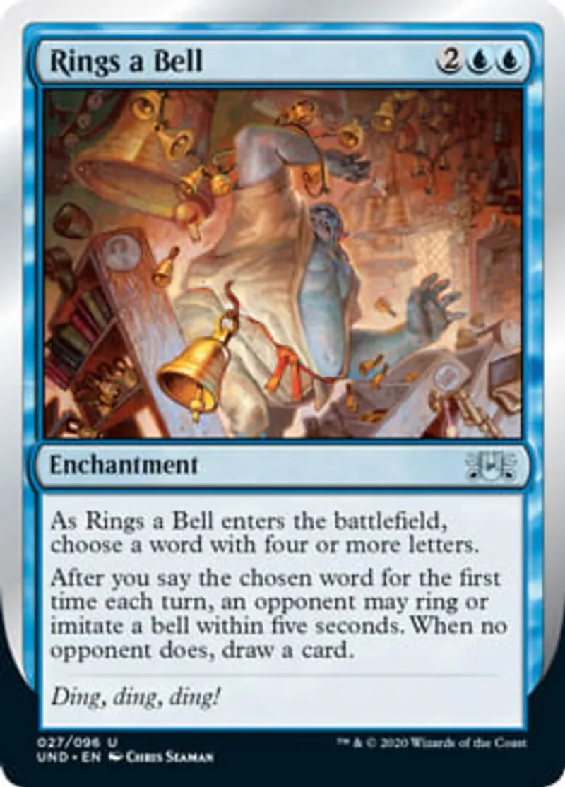 After you say the chosen word for the first time each turn, an opponent may ring or imitate a bell within five seconds. When no opponent does, draw a card. | ||