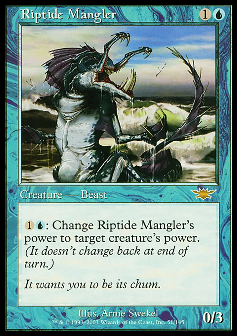 | Oracle Text | {{1}}{{u}}: Change Riptide Mangler's power to target creature's power. (This effect lasts indefinitely.) | ||