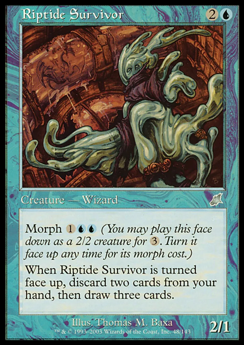 | Oracle Text | Morph {{1}}{{u}}{{u}} (You may cast this face down as a 2/2 creature for {{3}}. Turn it face up any time for its morph cost.) When Riptide Survivor is turned face up, discard two cards, then draw three cards. | ||