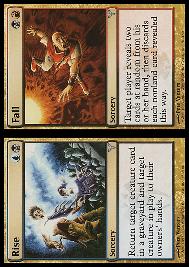 | Oracle Text | Rise Return target creature card in a graveyard and target creature in play to their owner's hands. Fall Target player reveals two cards at random from his or her hand, then discards each nonland card revealed this way. | ||