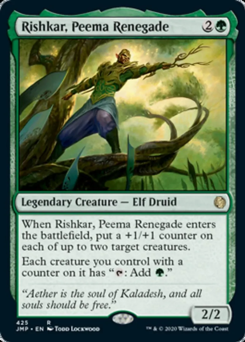 | Oracle Text | When Rishkar, Peema Renegade enters the battlefield, put a +1/+1 counter on each of up to two target creatures.