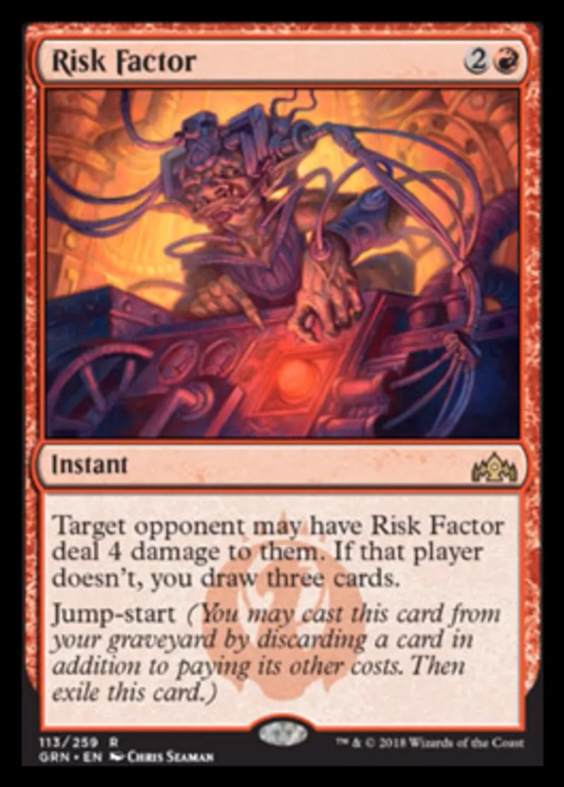 | Oracle Text | Target opponent may have Risk Factor deal 4 damage to them. If that player doesn't, you draw three cards. Jump-start (You may cast this card from your graveyard by discarding a card in addition to paying its other costs. Then exile this card.) | ||