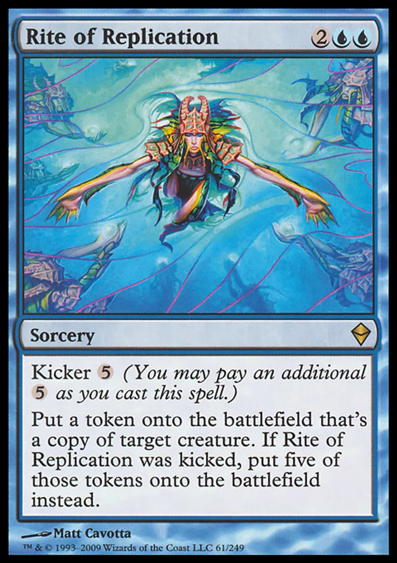 | Oracle Text | Kicker {{5}} (You may pay an additional {{5}} as you cast this spell.) Put a token that's a copy of target creature onto the battlefield. If Rite of Replication was kicked, put five of those tokens onto the battlefield instead. | ||