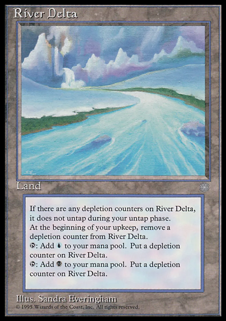 | Oracle Text | River Delta doesn't untap during your untap step if it has a depletion counter on it. At the beginning of your upkeep, remove a depletion counter from River Delta. {{t}}: Add {{u}} or {{b}} to your mana pool. Put a depletion counter on River Delta. | ||