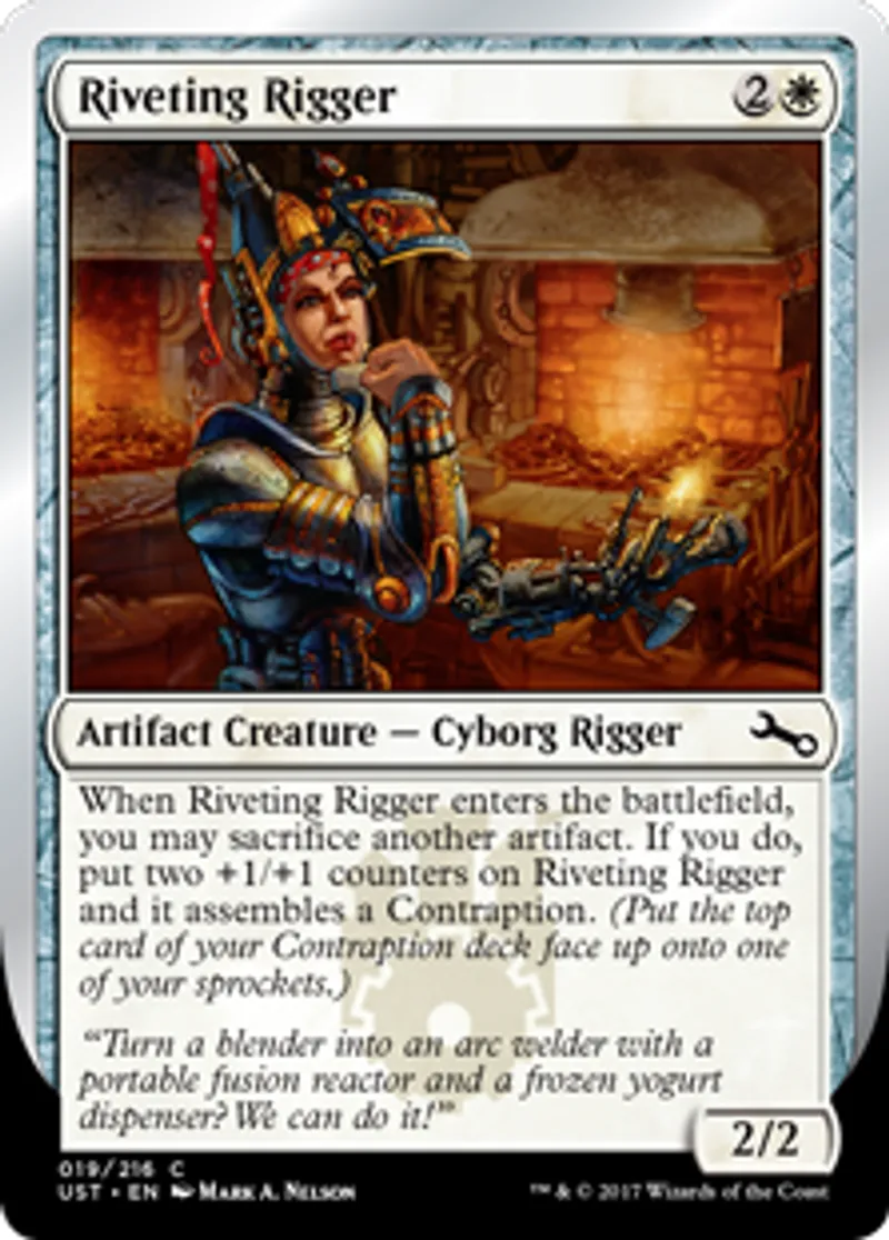 | Oracle Text | When Riveting Rigger enters the battlefield, you may sacrifice another artifact. If you do, put two +1/+1 counters on Riveting Rigger and it assembles a Contraption. (Put the top card of your Contraption deck face up onto one of your sprockets.) | ||