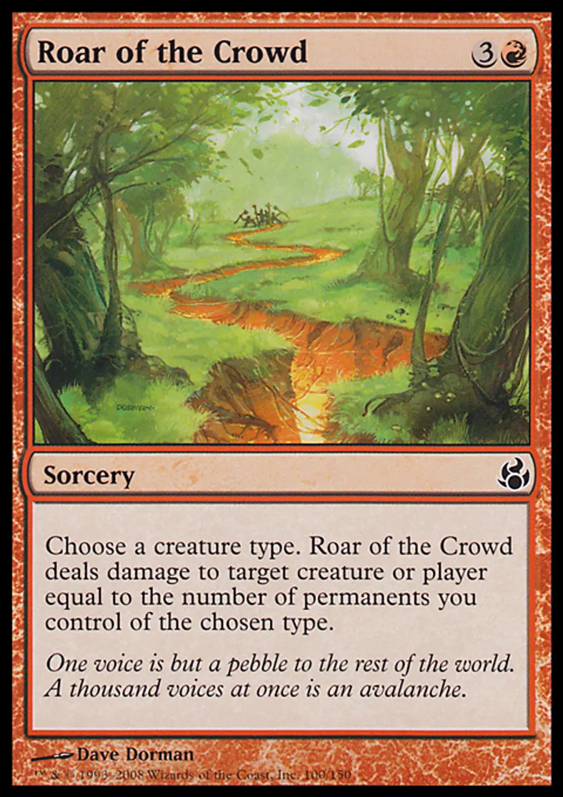 | Oracle Text | Choose a creature type. Roar of the Crowd deals damage to target creature or player equal to the number of permanents you control of the chosen type. | ||