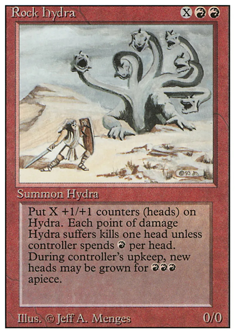 | Oracle Text | Rock Hydra enters the battlefield with X +1/+1 counters on it. For each 1 damage that would be dealt to Rock Hydra, if it has a +1/+1 counter on it, remove a +1/+1 counter from it and prevent that 1 damage. {{r}}: Prevent the next 1 damage that would be dealt to Rock Hydra this turn. {{r}}{{r}}{{r}}: Put a +1/+1 counter on Rock Hydra. Activate this ability only during your upkeep. | ||