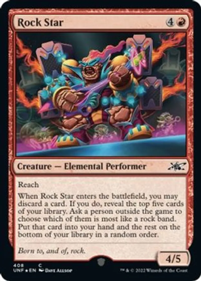 When Rock Star enters the battlefield, you may discard a card. If you do, reveal the top five cards of your library. Ask a person outside the game to choose which of them is most like a rock band. Put that card into your hand and the rest on the bottom of your library in a random order. | ||