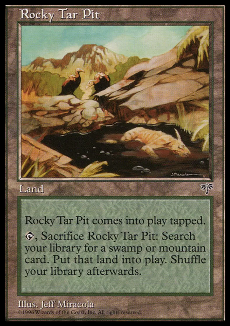 | Oracle Text | Rocky Tar Pit enters the battlefield tapped. {{t}}, Sacrifice Rocky Tar Pit: Search your library for a Swamp or Mountain card and put it onto the battlefield. Then shuffle your library. | ||