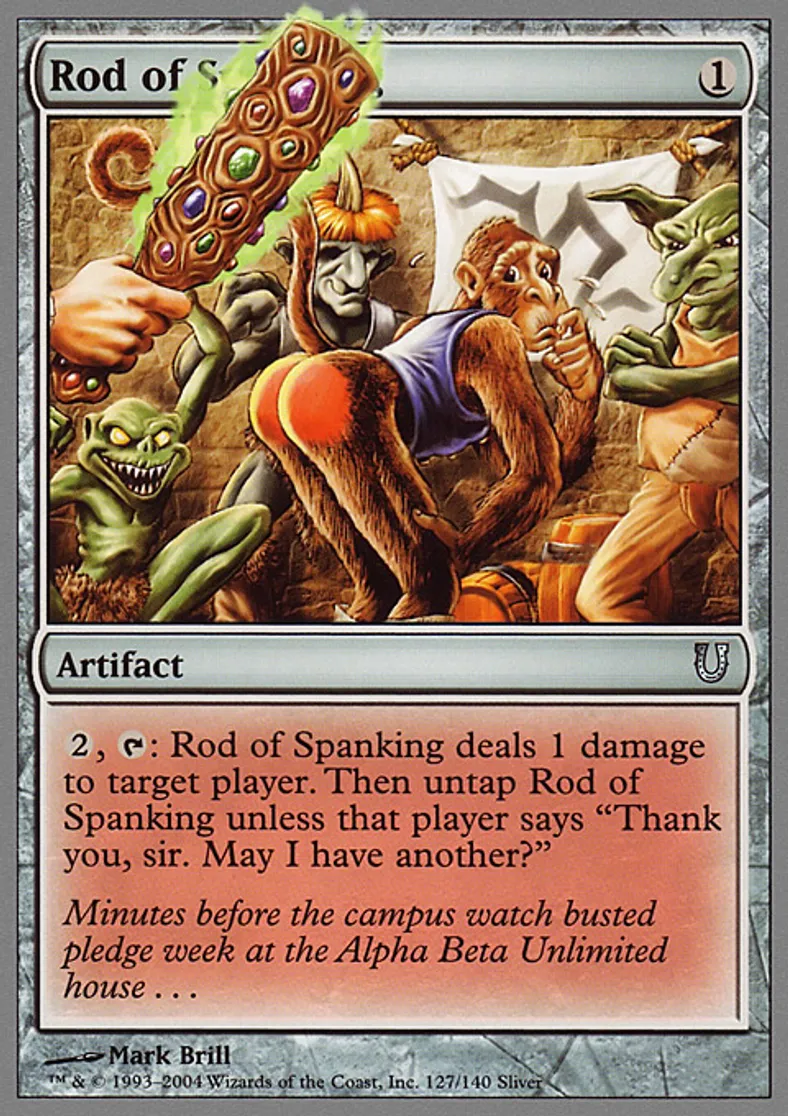 | Oracle Text | {{2}}, {{t}}: Rod of Spanking deals 1 damage to target player. Then untap Rod of Spanking unless that player says "Thank you, sir. May I have another?" | ||