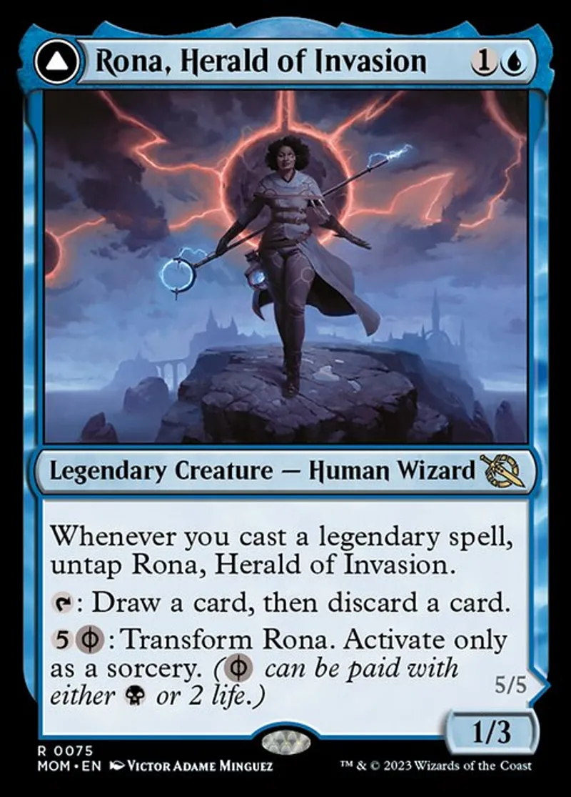 Magic: the Gathering (mtg) Rare Legendary Creature — Human Wizard // Legendary Creature — Phyrexian Wizard Rona, Herald of Invasion from March of the Machine (mom) last updated 2026-02-24 15:42:02