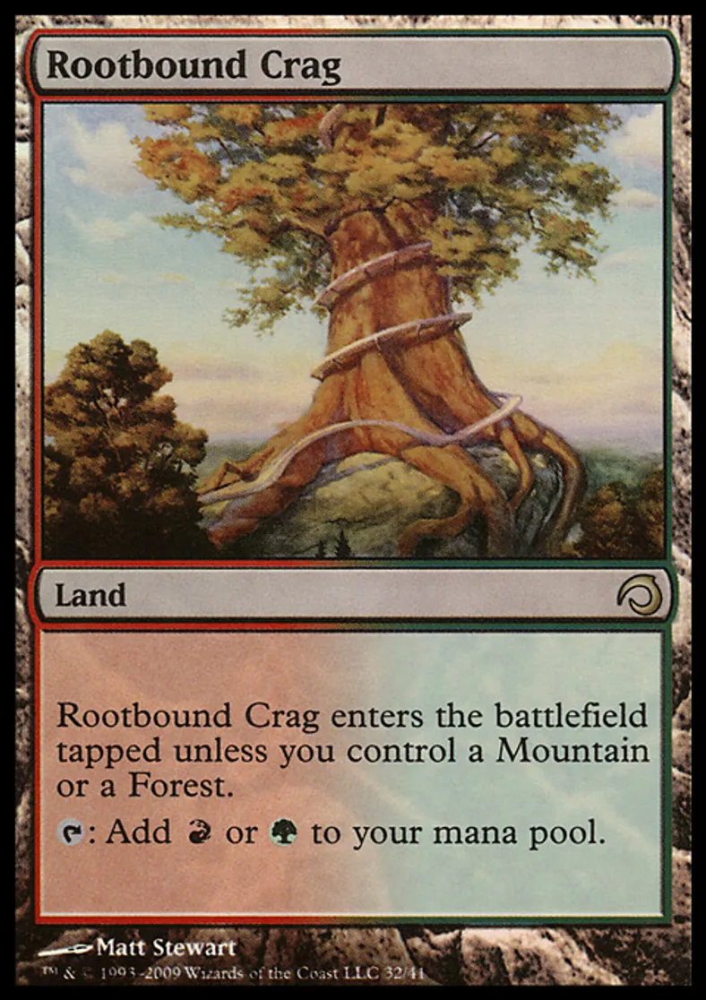 | Oracle Text | Rootbound Crag enters the battlefield tapped unless you control a Mountain or a Forest. {{t}}: Add {{r}} or {{g}} to your mana pool. | ||