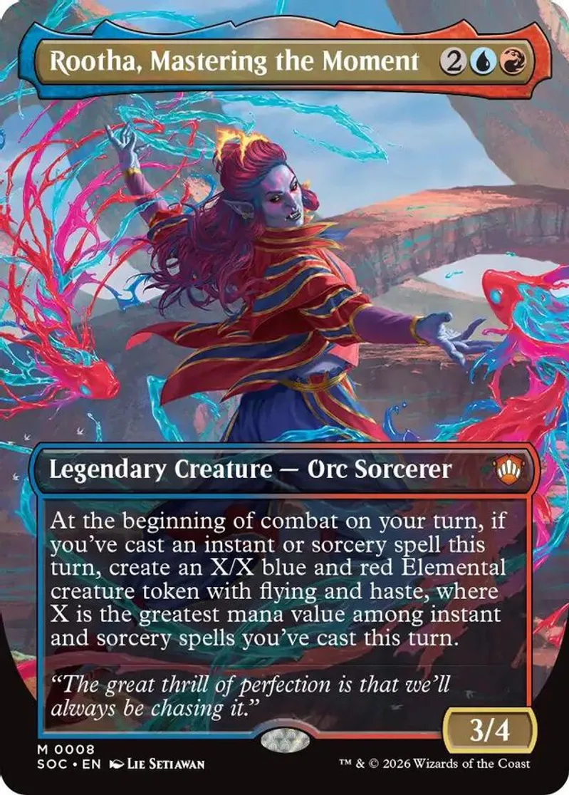 Magic: the Gathering (mtg) Mythic Rare legendary creature — orc sorcerer Rootha, Mastering the Moment from Commander: Secrets of Strixhaven (SOC) last updated 2026-04-17 00:14:36