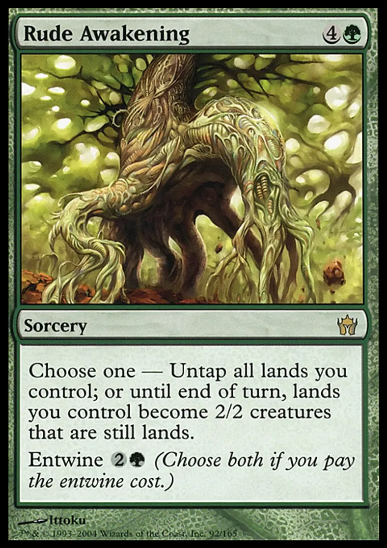 | Oracle Text | Choose one — Untap all lands you control; or until end of turn, lands you control become 2/2 creatures that are still lands. Entwine {{2}}{{g}} (Choose both if you pay the entwine cost.) | ||