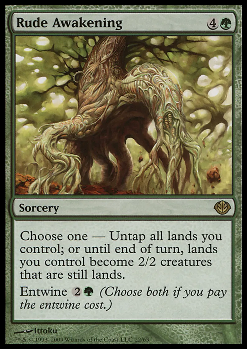 | Oracle Text | Choose one — Untap all lands you control; or until end of turn, lands you control become 2/2 creatures that are still lands. Entwine {{2}}{{g}} (Choose both if you pay the entwine cost.) | ||