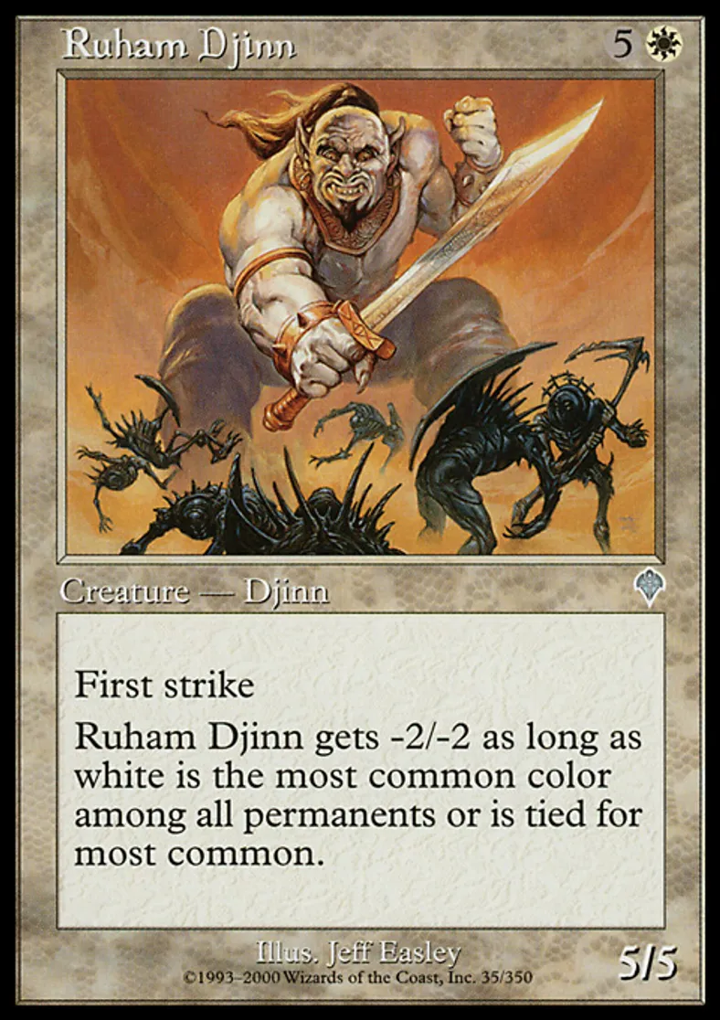 | Oracle Text | First strike Ruham Djinn gets -2/-2 as long as white is the most common color among all permanents or is tied for most common. | ||