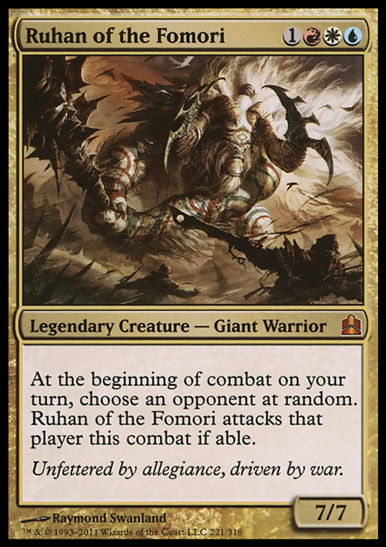 | Oracle Text | At the beginning of combat on your turn, choose an opponent at random. Ruhan of the Fomori attacks that player this combat if able. | ||