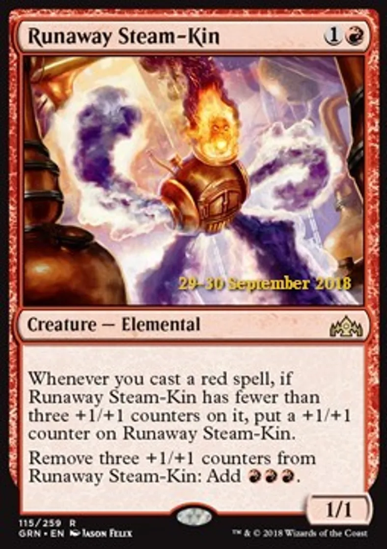 | Oracle Text | Whenever you cast a red spell, if Runaway Steam-Kin has fewer than three +1/+1 counters on it, put a +1/+1 counter on Runaway Steam-Kin. Remove three +1/+1 counters from Runaway Steam-Kin: Add {{R}}{{R}}{{R}}. | ||