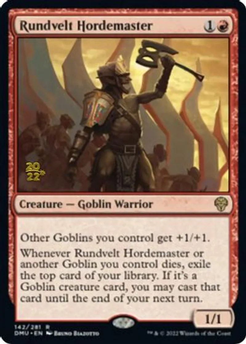 Whenever Rundvelt Hordemaster or another Goblin you control dies, exile the top card of your library. If it's a Goblin creature card, you may cast that card until the end of your next turn. | ||