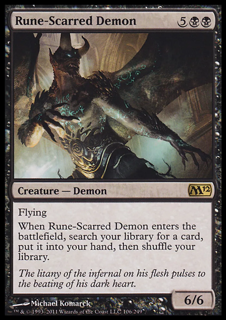 | Oracle Text | Flying When Rune-Scarred Demon enters the battlefield, search your library for a card, put it into your hand, then shuffle your library. | ||