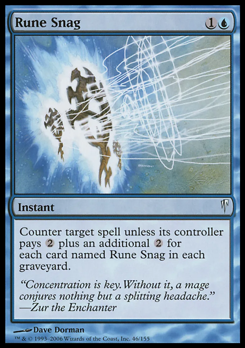 | Oracle Text | Counter target spell unless its controller pays {{2}} plus an additional {{2}} for each card named Rune Snag in each graveyard. | ||