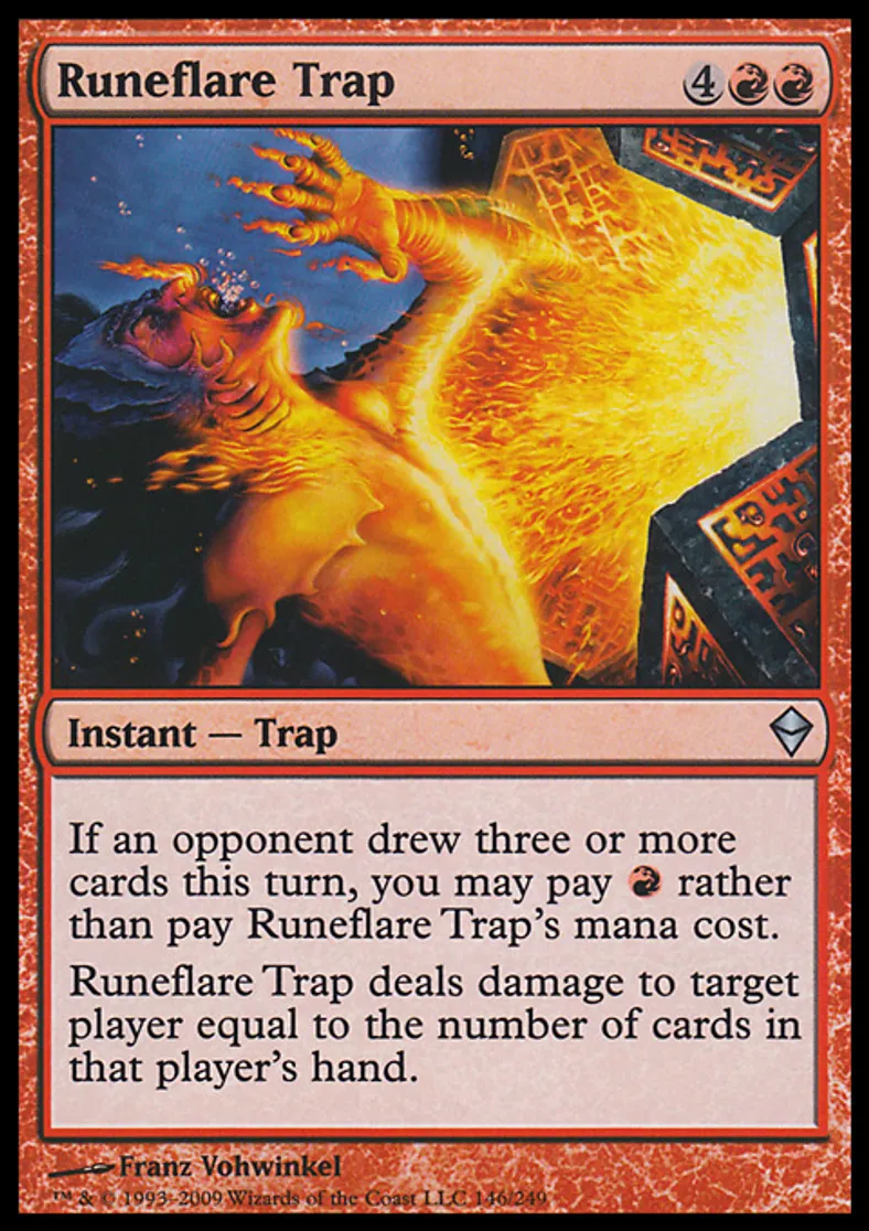 | Oracle Text | If an opponent drew three or more cards this turn, you may pay {{r}} rather than pay Runeflare Trap's mana cost. Runeflare Trap deals damage to target player equal to the number of cards in that player's hand. | ||