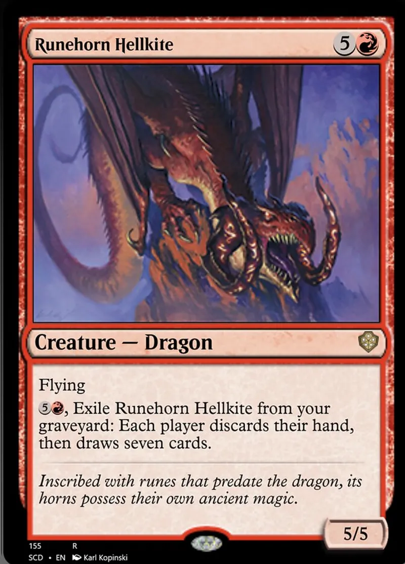 {5}{R}, Exile Runehorn Hellkite from your graveyard: Each player discards their hand, then draws seven cards. | ||