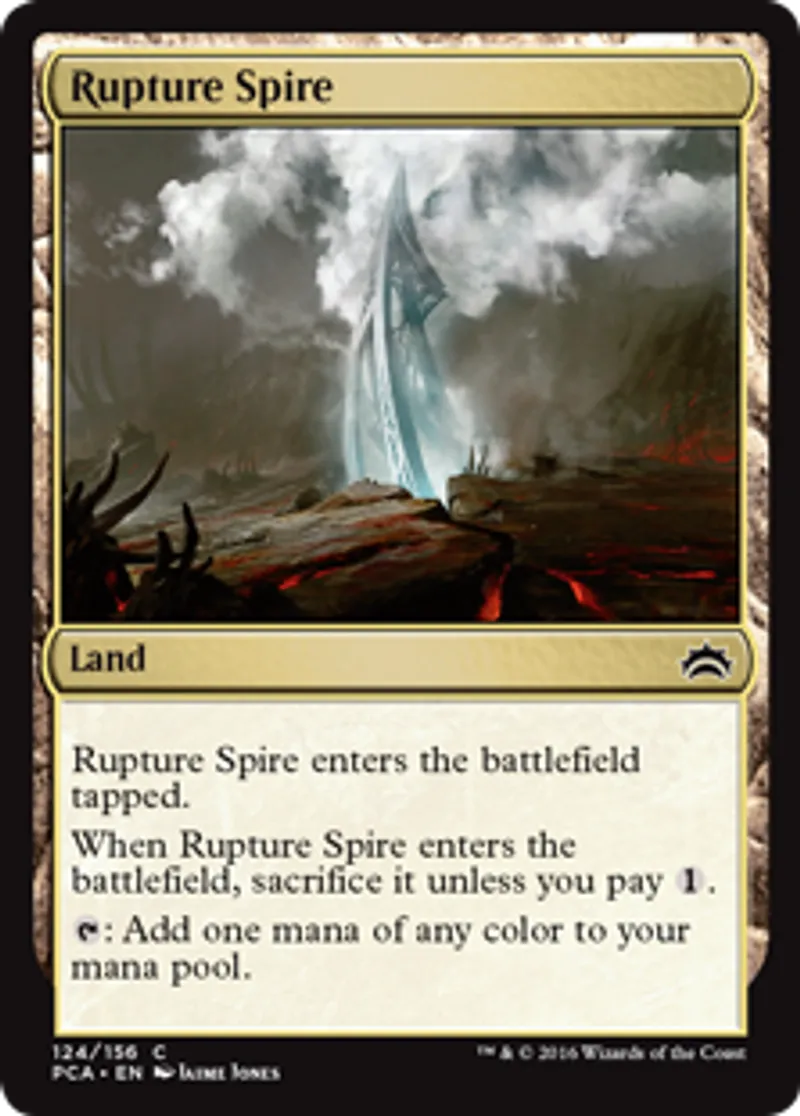 | Oracle Text | Rupture Spire enters the battlefield tapped. When Rupture Spire enters the battlefield, sacrifice it unless you pay {{1}}. {{t}}: Add one mana of any color to your mana pool. | ||