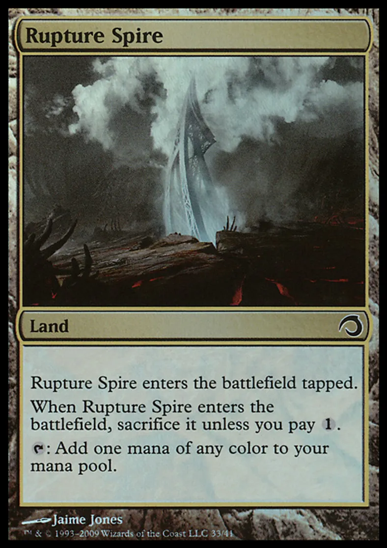 | Oracle Text | Rupture Spire enters the battlefield tapped. When Rupture Spire enters the battlefield, sacrifice it unless you pay {{1}}. {{t}}: Add one mana of any color to your mana pool. | ||