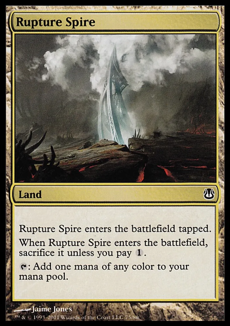 | Oracle Text | Rupture Spire enters the battlefield tapped. When Rupture Spire enters the battlefield, sacrifice it unless you pay {{1}}. {{t}}: Add one mana of any color to your mana pool. | ||
